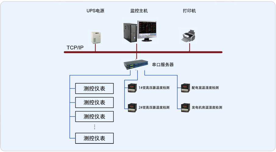 系統(tǒng)主要實(shí)現(xiàn)中國建設(shè)銀行股份有限公司云南分行本部地下B2變電所的0.4kV配電系統(tǒng)進(jìn)行用電監(jiān)測(cè)與電能管理;監(jiān)測(cè)范圍為改造變電所的T1、T2變壓器的饋線柜、母聯(lián)柜、電容補(bǔ)償柜,變壓器的相間溫度、配電室和發(fā)電機(jī)房的溫濕度,饋線柜和母聯(lián)柜側(cè)儀表進(jìn)行遠(yuǎn)程實(shí)時(shí)監(jiān)控和電能管理。該系統(tǒng)總計(jì)有29只儀表,分4條總線,都是直接通過屏蔽雙絞線走管道拉至值班室后連接到串口服務(wù)器上,實(shí)現(xiàn)總線上儀表與監(jiān)控主機(jī)的數(shù)據(jù)連通。