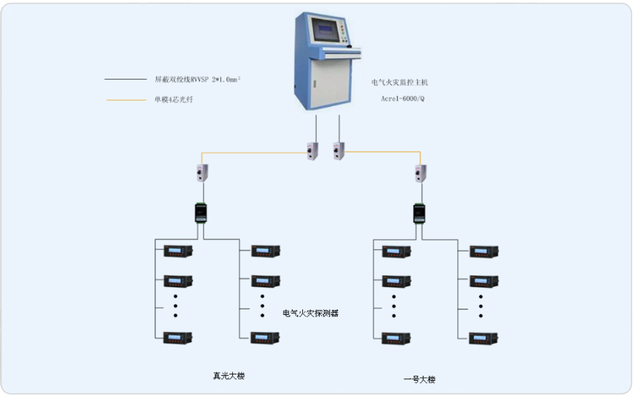 本期工程的監(jiān)控范圍主要為真光廣學(xué)大樓及新建一號(hào)樓,新建一號(hào)樓47個(gè)漏電流監(jiān)控裝置分布在B1~8F中,真光大樓33個(gè)漏電流監(jiān)控裝置分布在B1F~9F中,現(xiàn)為本項(xiàng)目設(shè)計(jì)一套Acrel-6000電氣火災(zāi)監(jiān)控系統(tǒng),監(jiān)控裝置通過(guò)集線器及光纖至電氣火災(zāi)監(jiān)控裝置,并由此來(lái)實(shí)時(shí)監(jiān)測(cè)商業(yè)樓內(nèi)重要回路的漏電流,以確保商業(yè)區(qū)配電系統(tǒng)的電氣安全。