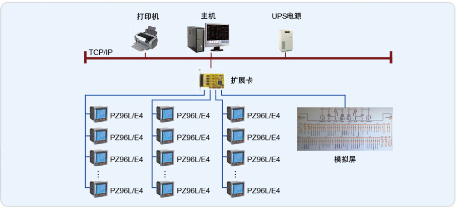 Acrel-2000電力監(jiān)控主要實現(xiàn)北京電氣工程學(xué)校變電所的0.4kV配電系統(tǒng)的用電監(jiān)測與模擬屏的實時監(jiān)控;監(jiān)測范圍為變電所的T1、T2變壓器的低壓進(jìn)線柜、聯(lián)絡(luò)柜、饋線柜中的智能電力儀表和模擬屏,從而實現(xiàn)遠(yuǎn)程實時監(jiān)測和模擬屏的實時監(jiān)控。該系統(tǒng)總計有61只儀表(其中全部為PZ系列智能儀表)和一個模擬屏,分4條總線,由于變電所與值班室距離較近,采用變電所內(nèi)自行組網(wǎng),然后通過擴展卡直接接至電腦,實現(xiàn)該現(xiàn)場總線上儀表、模擬屏與監(jiān)控主機的數(shù)據(jù)連通。