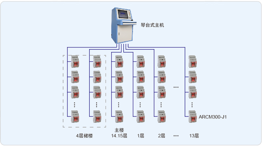 現場共有ARCM300-J1剩余電流式儀表280只,分別分布于15層主樓和4層裙樓樓層內,現場火災探測器采用總線方式接至位于主樓1層消防控制室內的 Acrel-6000琴臺式電氣火災監控系統。