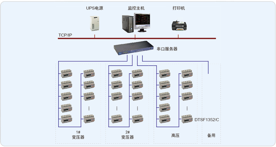 該現(xiàn)場為高壓10kV和0.4KV低壓配電室,共53塊儀表多功能智能儀表( DTSF1352/C),監(jiān)控值班室位于變電所隔壁,通過組態(tài)軟件Acrel-2000實現(xiàn)對現(xiàn)場儀表的實時監(jiān)測,并記錄歷史數(shù)據(jù)自動生成報表,以便查詢。為滿足配電室統(tǒng)一監(jiān)控的要求,配電現(xiàn)場安裝的安科瑞公司網(wǎng)絡電力儀表通過屏蔽雙絞線手拉手式相連至后臺主機內的工業(yè)串口卡,實現(xiàn)對現(xiàn)場數(shù)據(jù)的采集,存儲,處理,實時顯示以及歷史查詢。