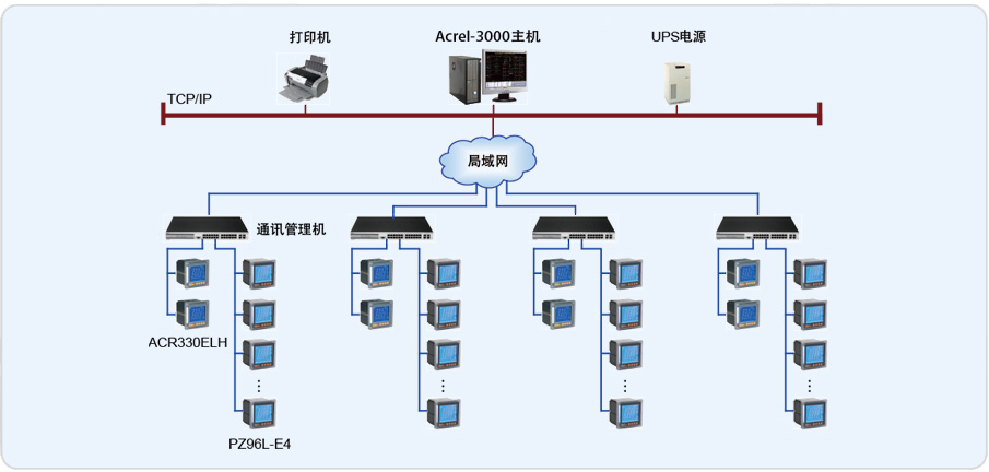 該系統總計有79只儀表(其中包括8只ACR330ELH諧波儀表,71只PZ系列智能儀表),分8條總線,由于四個變電所之間距離較遠,并且較為分散,采用每個變電所內自行組網,然后并入惠氏公司內部局域網的方式,實該現場總線上儀表與監控主機的數據連通。