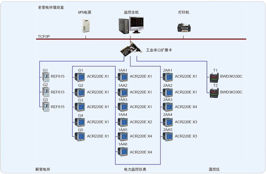 安科瑞電氣股份有限公司于2011年8月承接了蘇州軸承廠有限公司電力監(jiān)控系統(tǒng)的設(shè)計與實施。本監(jiān)控系統(tǒng)主要實現(xiàn)蘇州軸承廠有限公司的10/0.4kV配電系統(tǒng)進(jìn)行用電監(jiān)測與電能管理;監(jiān)測范圍為新建變電所的T1、T2變壓器進(jìn)線柜,聯(lián)絡(luò)柜,溫控儀,高壓側(cè)儀表及綜保進(jìn)行遠(yuǎn)程實時監(jiān)控和電能管理。該系統(tǒng)總計有31只儀表(其中包括26只ACR220E,3只ABB,2只溫控儀),分3條總線,都是直接通過屏蔽雙絞線走管道拉至值班室連接到主機擴展卡上,實現(xiàn)總線上儀表與監(jiān)控主機的數(shù)據(jù)連通。