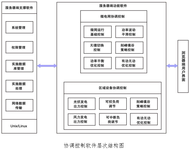 協調控制器采用B/S結構,包括硬件控制器、功能控制軟件和瀏覽器用戶工作界面。協調控制器的軟件體系結構如下圖所示。協調控制器的服務器端包括支撐軟件和功能軟件兩部分。功能軟件包括微電網協調控制和設備協調控制。微電網協調控制功能包括微網運行基礎控制、無縫切換控制、功率平衡優化控制、功率波動平滑控制、有功功率整體優化控制、無功電壓整體優化控制、電能質量優化控制等。設備協調控制功能包括光伏發電出力控制、可控負荷調節、可中斷負荷調節、有功無功優化控制。協調控制器的瀏覽器端是用戶工作界面,可觀察協調控制功能軟件工作狀態、配置參數、控制工作模式等。