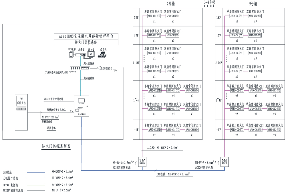 AFRD100防火門監(jiān)控系統(tǒng),是根據(jù)國家現(xiàn)行規(guī)范標(biāo)準(zhǔn)由安科瑞電氣股份有限公司研發(fā)的全數(shù)字化獨(dú)立運(yùn)行的系統(tǒng),已通過國家消防電子產(chǎn)品質(zhì)量監(jiān)督檢驗中心的消防電子產(chǎn)品試驗認(rèn)證,并且均通過嚴(yán)格的EMC電磁兼容試驗,保證了該系列產(chǎn)品在低壓配電系統(tǒng)中的安全正常運(yùn)行,現(xiàn)均已批量生產(chǎn)并在全國得到廣泛地應(yīng)用。該系統(tǒng)通過對電動閉門器、電磁釋放器、門磁開關(guān)等進(jìn)行信號采集及控制,實現(xiàn)了防火隔離和防煙,并根據(jù)用戶的需求,還可以與AcrelEMS企業(yè)微電網(wǎng)管理云平臺或電氣火災(zāi)自動報警系統(tǒng)等進(jìn)行數(shù)據(jù)交換和共享。