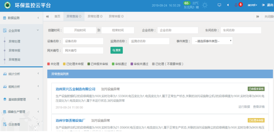 AcrelCloud-3000環保用電監管云平臺依托創新的物聯網電力傳感技術,實時采集企業總用電、生產設備及環保治理設備用電數據,通過關聯分析、超限分析、停電分析、停限產分析,結合及時發現環保治理設備未開啟、異常關閉及減速、空轉、降頻等異常情況,同時通過數據分析還可以實時監控限產和停產整治企業運行狀態,用戶可以利用PC、手機、平板電腦等多種終端實現對平臺的訪問。