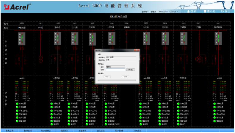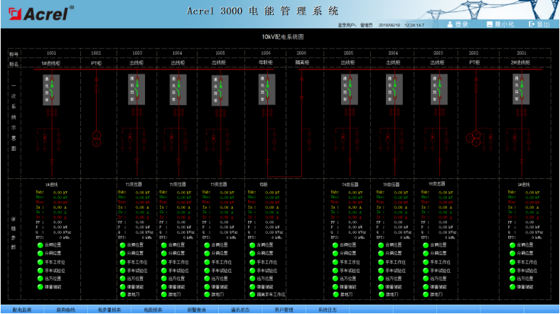 系統(tǒng)人機(jī)界面友好,以配電一次圖的形式直觀顯示配電線路的運(yùn)行狀態(tài),實(shí)時(shí)監(jiān)測各回路電壓、電流、功率、功率因數(shù)、電能等電參數(shù)信息,動(dòng)態(tài)監(jiān)視各配電回路斷路器、隔離開關(guān)、地刀等合、分狀態(tài),以及有關(guān)故障、告警等信號。