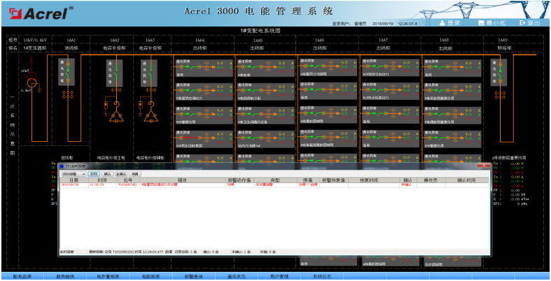 系統(tǒng)具有實(shí)時(shí)報(bào)警功能,系統(tǒng)能夠?qū)ε潆娀芈窋嗦菲鳌⒏綦x開關(guān)、接地刀分、合動(dòng)作等遙信變位,保護(hù)動(dòng)作、事故跳閘,以及電壓、電流、功率、功率因數(shù)越限等事件進(jìn)行實(shí)時(shí)監(jiān)測,并根據(jù)事件等級發(fā)出告警。系統(tǒng)報(bào)警時(shí)自動(dòng)彈出實(shí)時(shí)報(bào)警窗口,并發(fā)出聲音或語音提醒。
