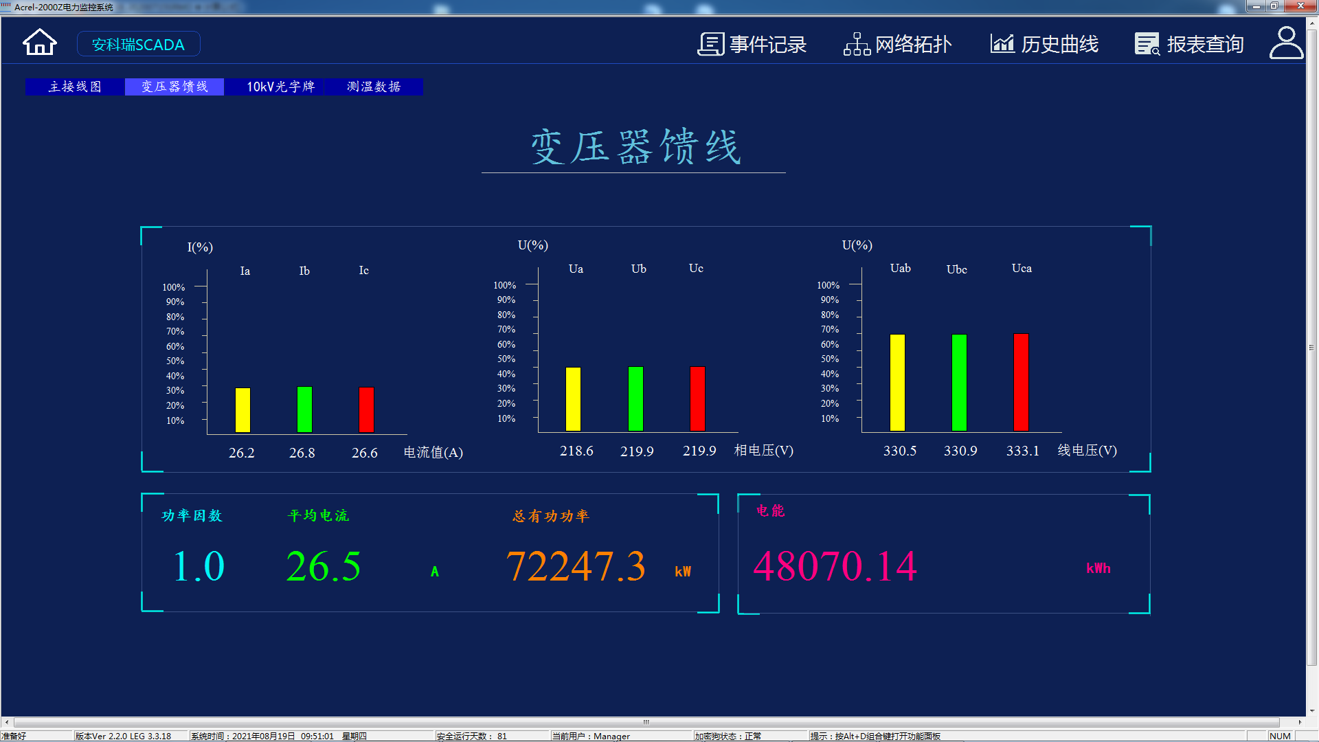 系統(tǒng)提供了完整的SCADA功能,包括主接線圖、設備工況、實時數(shù)據(jù)顯示、定值管理、SOE報警/記錄/查詢/打印、棒圖、實時/歷史曲線、語音報警、歷史信息查詢、用戶權限管理、各種運行數(shù)據(jù)統(tǒng)計分析報表等。系統(tǒng)可以協(xié)助運維人員快速故障分析、定位和排除問題,對配電系統(tǒng)和用電設備進行用能分析和能效管理。可以幫助企業(yè)提高供電可靠性、降低運營成本、提高生產(chǎn)效率,加快供配電過程中異常狀態(tài)的反應速度。