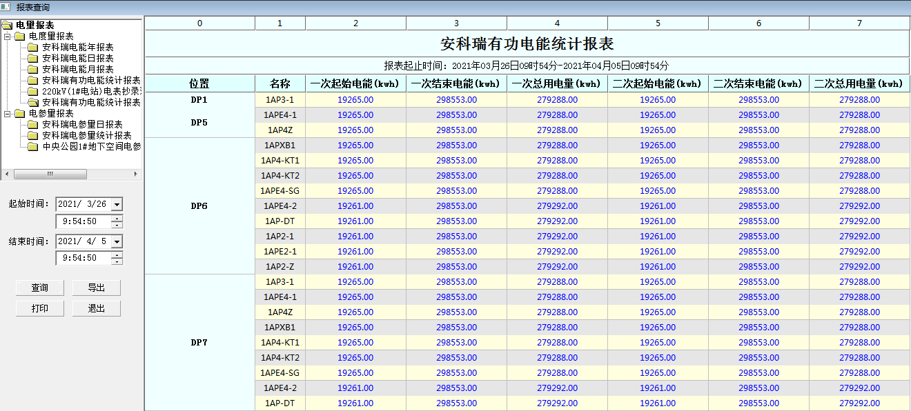 Acrel-1000綜合自動化監(jiān)控系統(tǒng)可以查詢各回路或設備指定時間的運行參數(shù),報表中顯示電參量信息應包括:各相電流、三相電壓、總功率因數(shù)、總有功功率、總無功功率、正向有功電能、溫度值等。可以按照日、月、年的格式進行查詢、導出、打印。