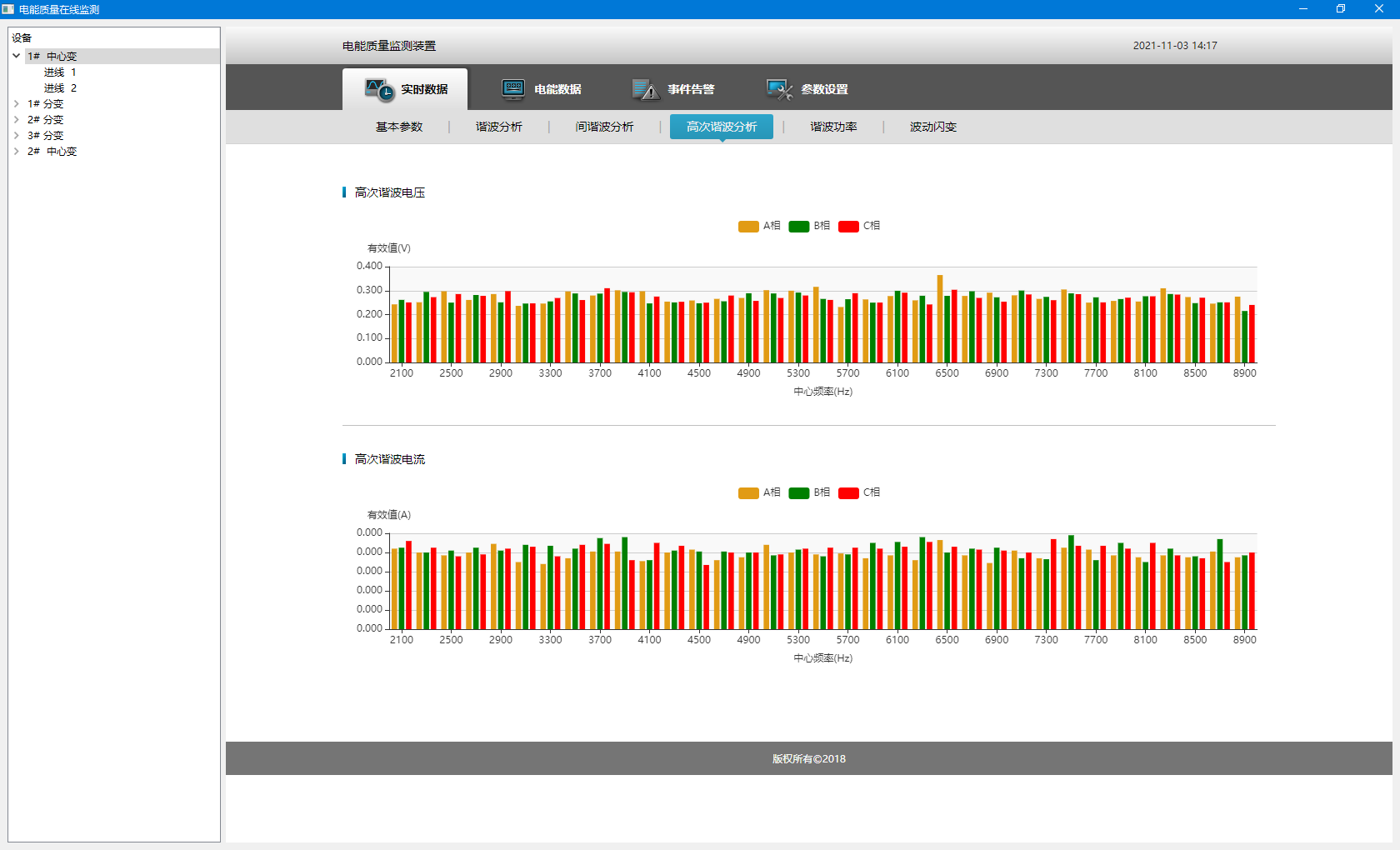 實時監(jiān)測總進線和重要出線回路的供電電源電能質(zhì)量,包括穩(wěn)態(tài)數(shù)據(jù)監(jiān)測、暫態(tài)數(shù)據(jù)監(jiān)測和故障錄波分析。對供電系統(tǒng)中的電壓偏差、頻率偏差、三相電壓不平衡、三相電流不平衡、2~63次諧波電壓、2~63次諧波電流、0.5~63.5次間諧波電壓、0.5~63.5次間諧波電流、諧波功率、諧波畸變率等實時監(jiān)測,并以柱狀圖進行諧波分析。