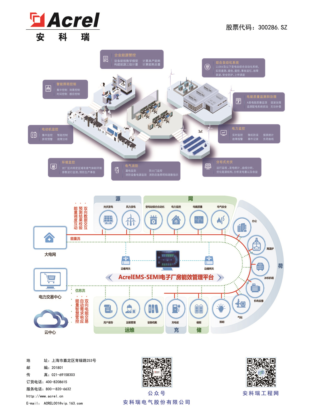 經過精心的準備,安科瑞攜AcrelEMS-SEMI電子廠房能效管理平臺助力綠色工廠建設和運行,電子廠房能效管理平臺集變電站綜合自動化、電力監控、電能質量分析及治理、電氣安全、能耗分析、照明控制、設備運維于一體,為建立可靠、安全的工廠能源管理體系提供數據支持。同時引入先進技術,配合廠務系統優化,簡化全廠管理,并利用實時數據,優化能效并預防風險,保障關鍵制造設備的穩定運行和良品率,降低綜合成本。