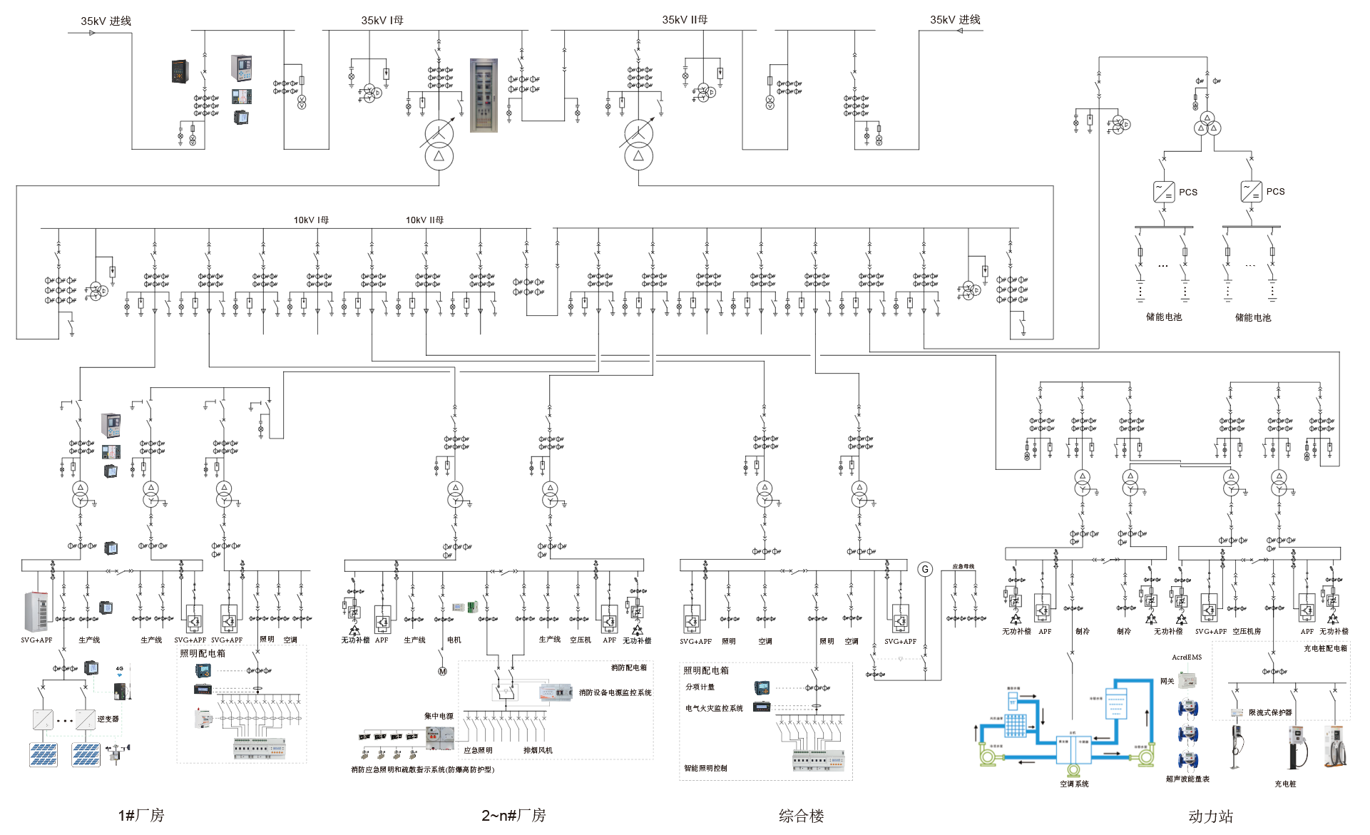 電力監(jiān)控系統(tǒng)實(shí)現(xiàn)對(duì)園區(qū)變電站、配電房內(nèi)斷路器、變壓器、柴油發(fā)電機(jī)以及其它重要設(shè)備進(jìn)行監(jiān)視、測量、記錄、報(bào)警等功能,并與保護(hù)設(shè)備和遠(yuǎn)方控制中心及其他設(shè)備通信,實(shí)時(shí)掌握?qǐng)@區(qū)變電站和配電房運(yùn)行狀況,快速排除故障,保障園區(qū)供電可靠性。