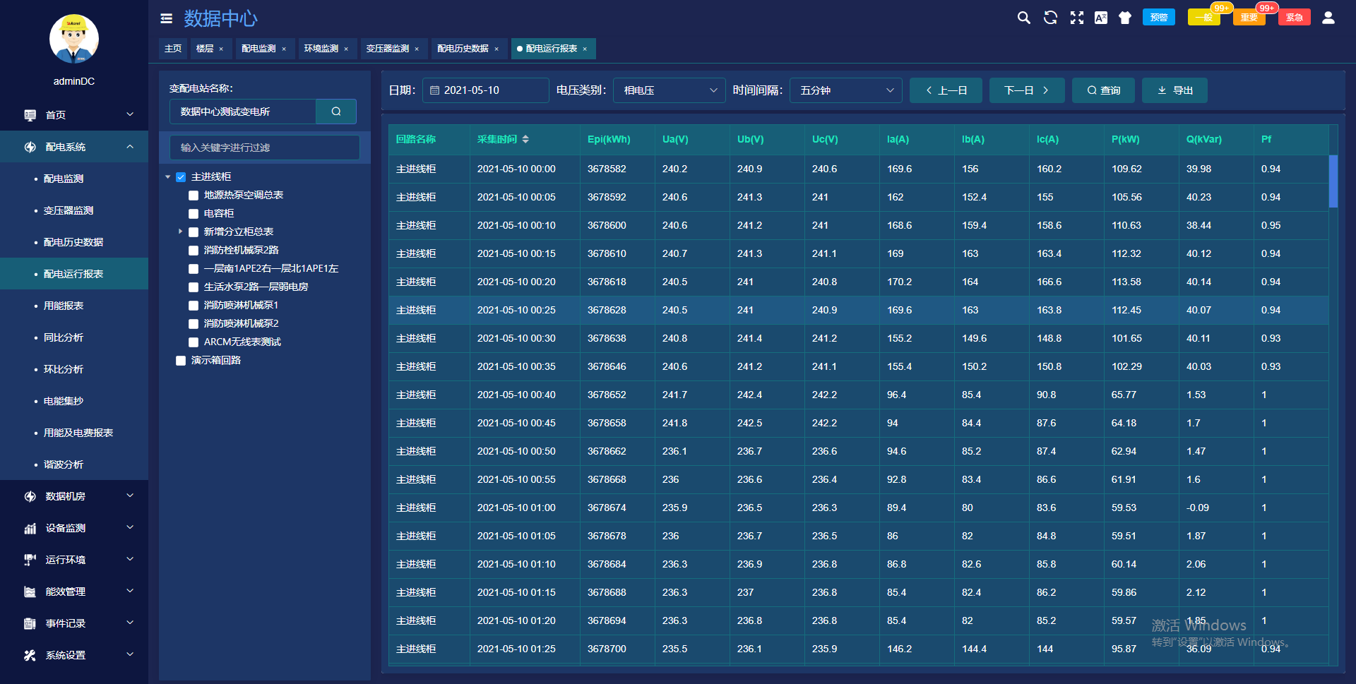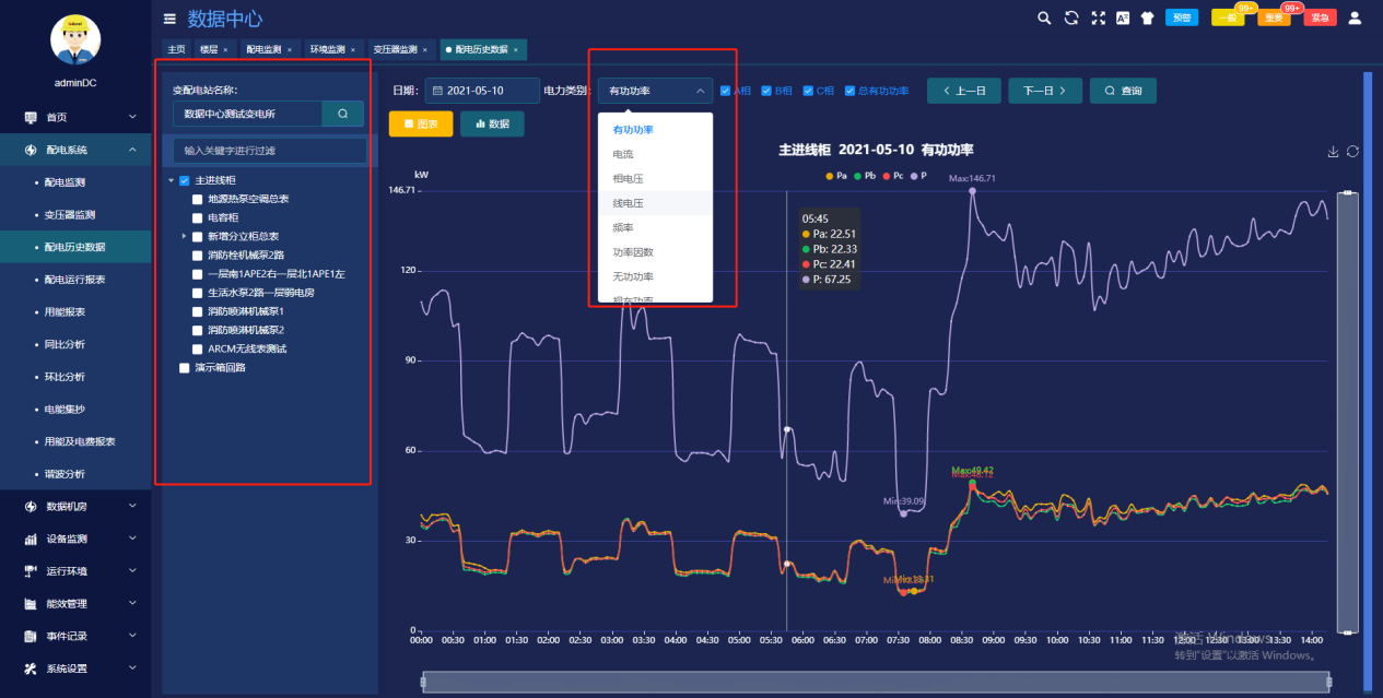 配電歷史數據可以展示每個配電回路的電流,電壓,功率因數等參數。并且可以通過日期,查詢歷史數據。
