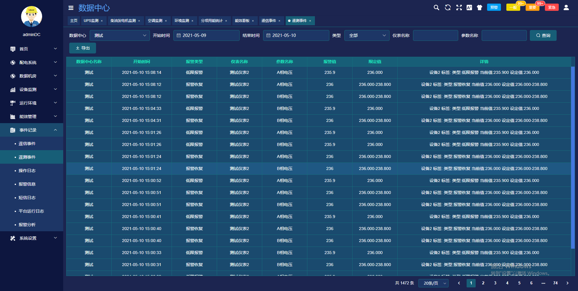 顯示當前數據中心各遙測量、如電流、電壓、功率等電參量越線的報警情況。