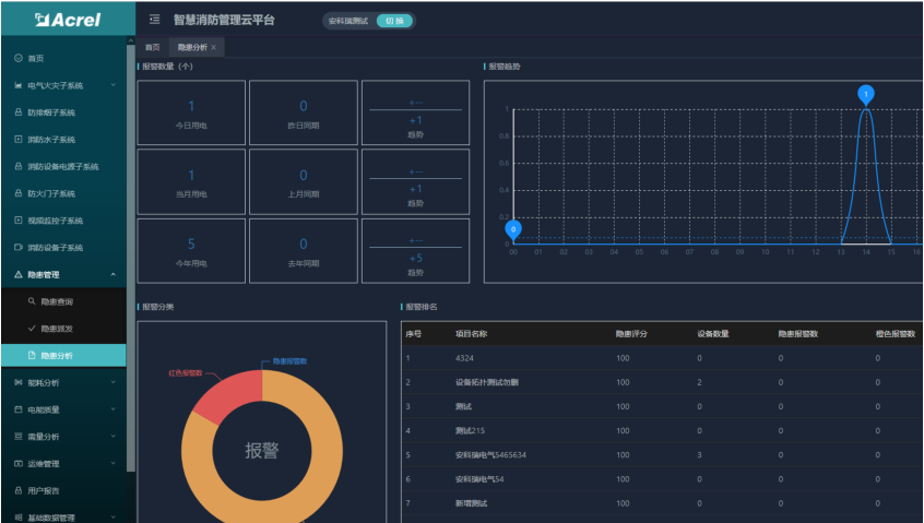 用戶登錄成功之后進入首頁,如圖所示。主要展示的內(nèi)容有:項目概況、設(shè)備狀態(tài)、探測器分類、設(shè)備報警信息、報警分類、報警統(tǒng)計、設(shè)備臺賬信息等。其中百度地圖可以選配成3D建筑模型。