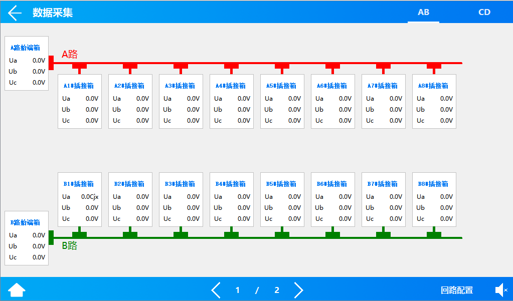 在主頁(yè)點(diǎn)擊數(shù)據(jù)采集按鈕后,進(jìn)入系統(tǒng)圖界面:此界面顯示了每個(gè)箱子的電壓。