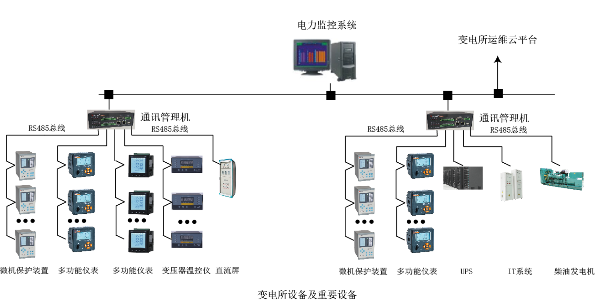 系統采用分布式結構,微機保護裝置、多功能儀表、變壓器溫控器、直流屏、柴油發電機控制屏等設備通過RS485總線或者以太網接入智能網關,經過協議轉換、數據處理后上傳至電力監控系統,實現遙測、遙信、遙控、異常報警等功能。