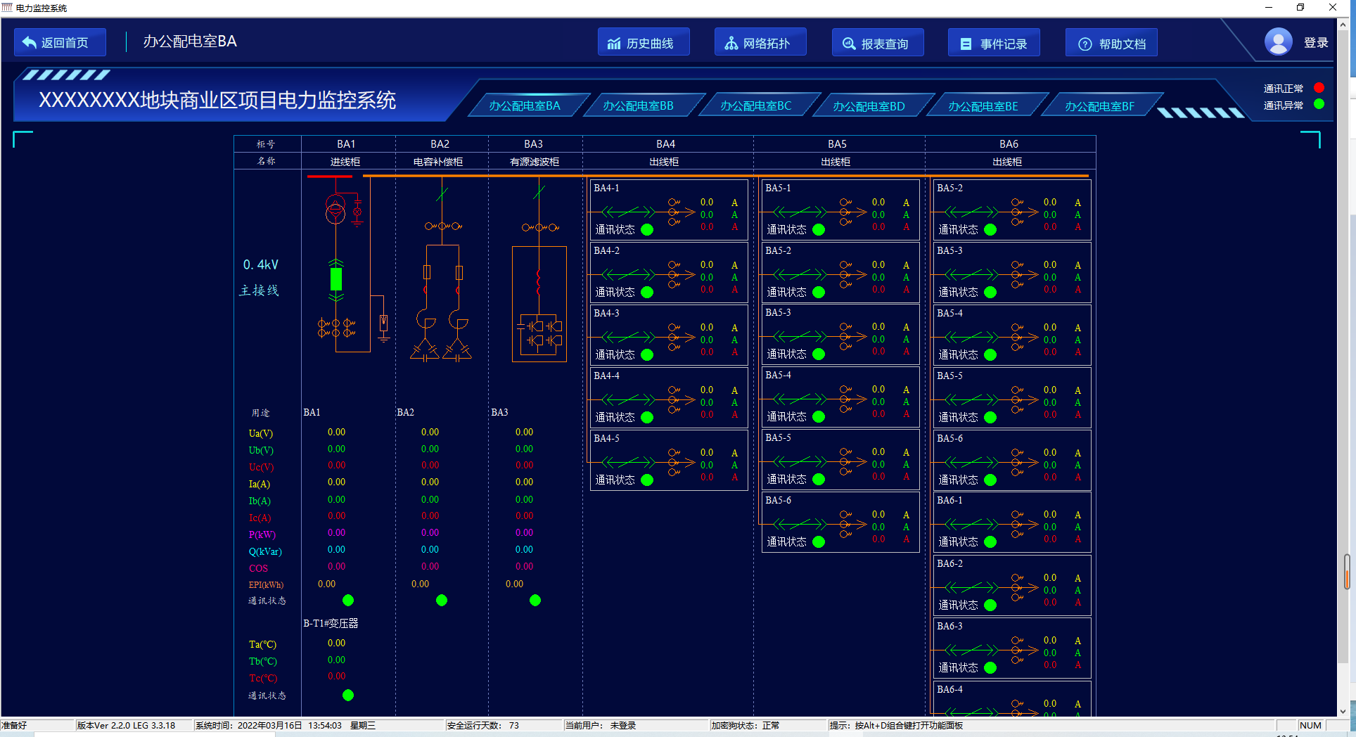 系統人機界面友好,以配電一次圖的形式直觀顯示配電線路的運行狀態,實時監測各回路電壓、電流、功率、功率因數、電能等電參數信息,動態監視各配電回路斷路器、隔離開關、地刀等合分狀態、柴油發電機狀態、柴油液位、UPS狀態、電池信息等,以及有關故障、告警等信號。
