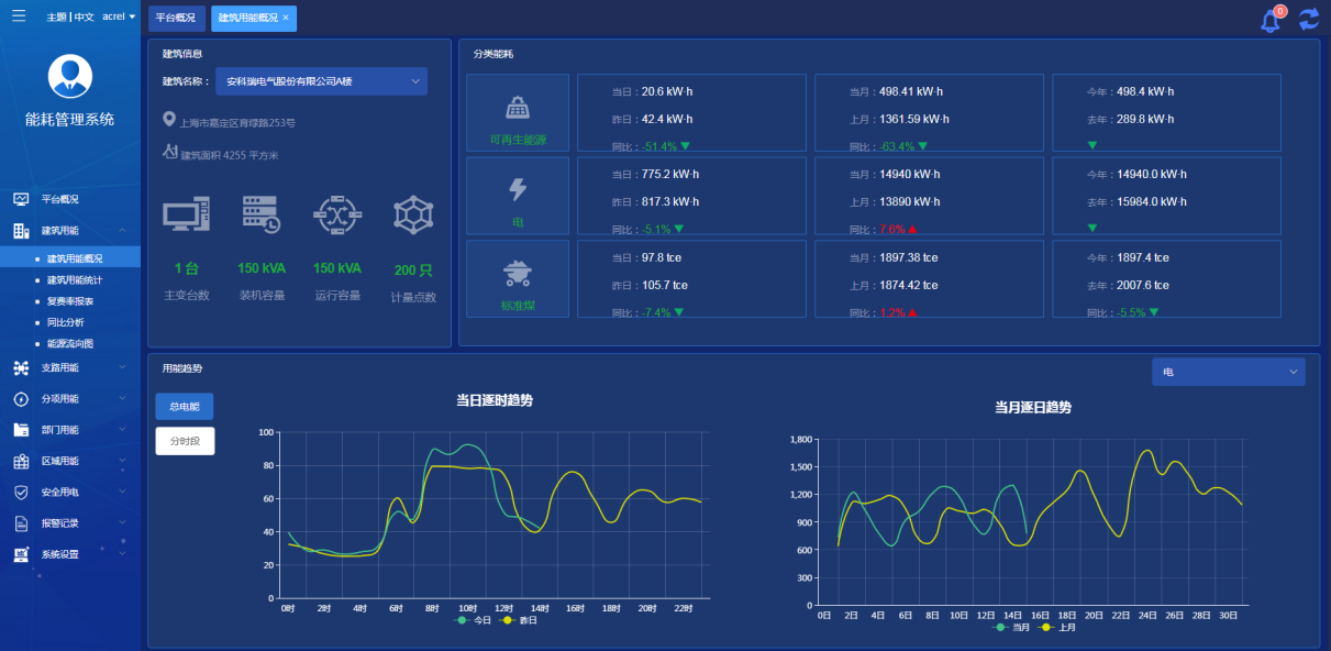 主要展示被選中建筑物基本信息,建筑各個分類用能對比,當(dāng)日逐時趨勢,當(dāng)月逐日趨勢和尖峰平谷分時段用能柱狀圖。能源類型可選擇電、水、可再生能源等等能源類型,并折算標(biāo)煤。