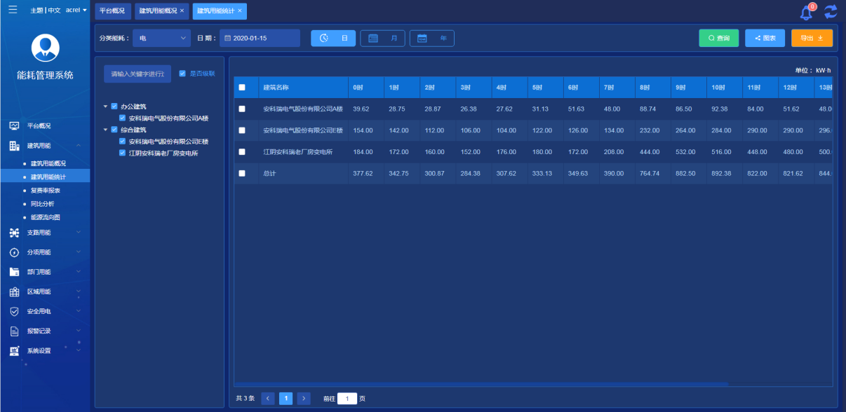 統(tǒng)計當(dāng)前賬號下所有建筑日、月、年用能統(tǒng)計報表,可選擇以報表或者圖表方式顯示,可導(dǎo)出excel表格形式保存。