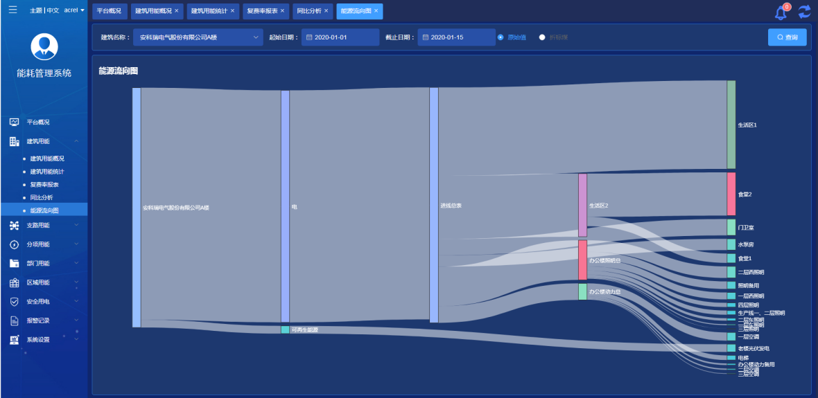 通過圖形方式直觀顯示當(dāng)前建筑能源消耗流向,鼠標(biāo)懸浮可以顯示當(dāng)前區(qū)域或者回路的用能數(shù)據(jù),起始日期和截止日期可選擇。
