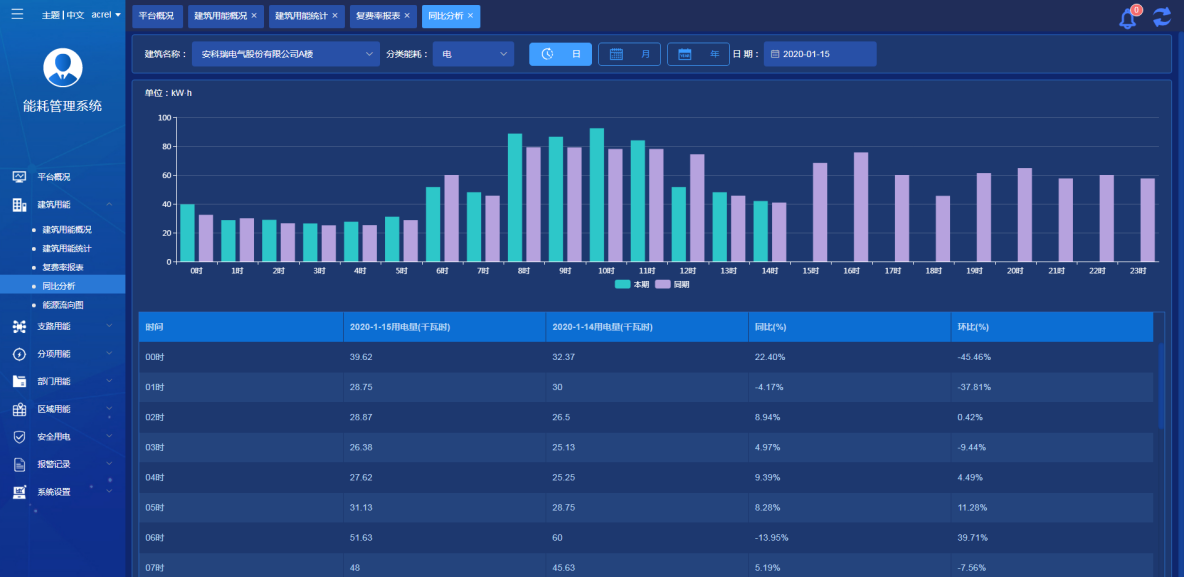 可選擇查看當(dāng)前建筑用能數(shù)據(jù)同比和環(huán)比分析比較,可選擇日/月/年周期進行對比,通過柱狀圖和百分比數(shù)據(jù)顯示對比結(jié)果。