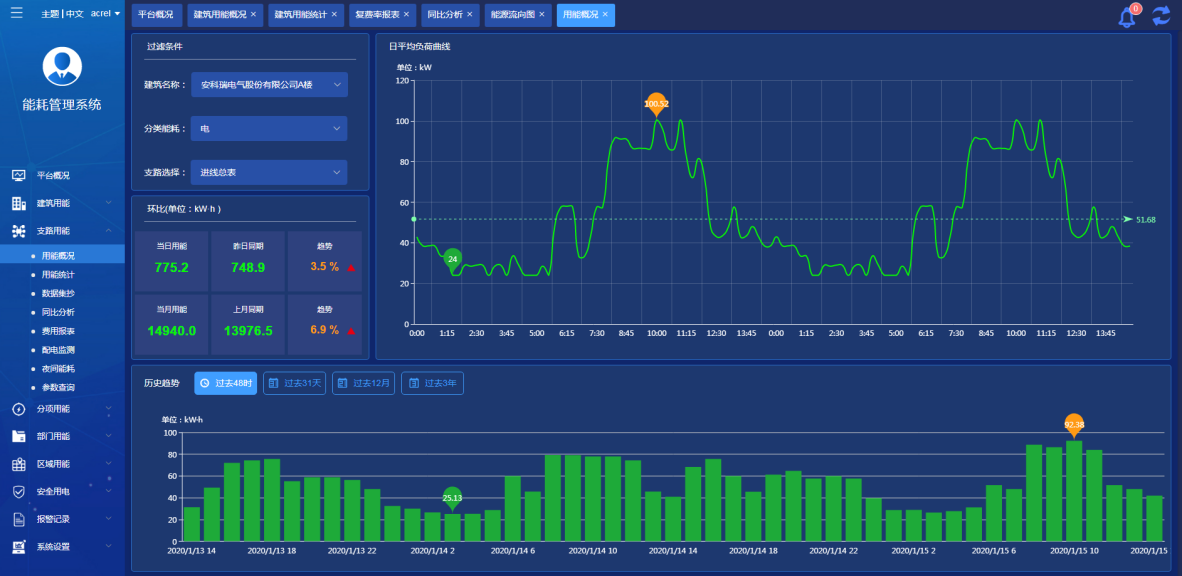 可選擇查看具體某個回路的能源消耗趨勢,包括日均負(fù)荷曲線展示、日月用能對比數(shù)據(jù)、過去48小時、過去31天、過去12個月、過去3年的能源消耗數(shù)據(jù)。