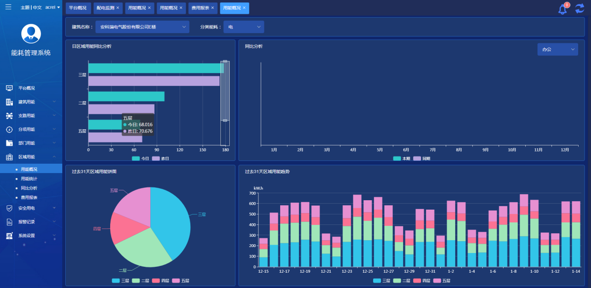 展示當(dāng)前建筑各區(qū)域的用能情況,通過餅圖、柱狀圖顯示能源占比、同比對比以及分項用能趨勢,可按照樓、樓層等方式區(qū)分。