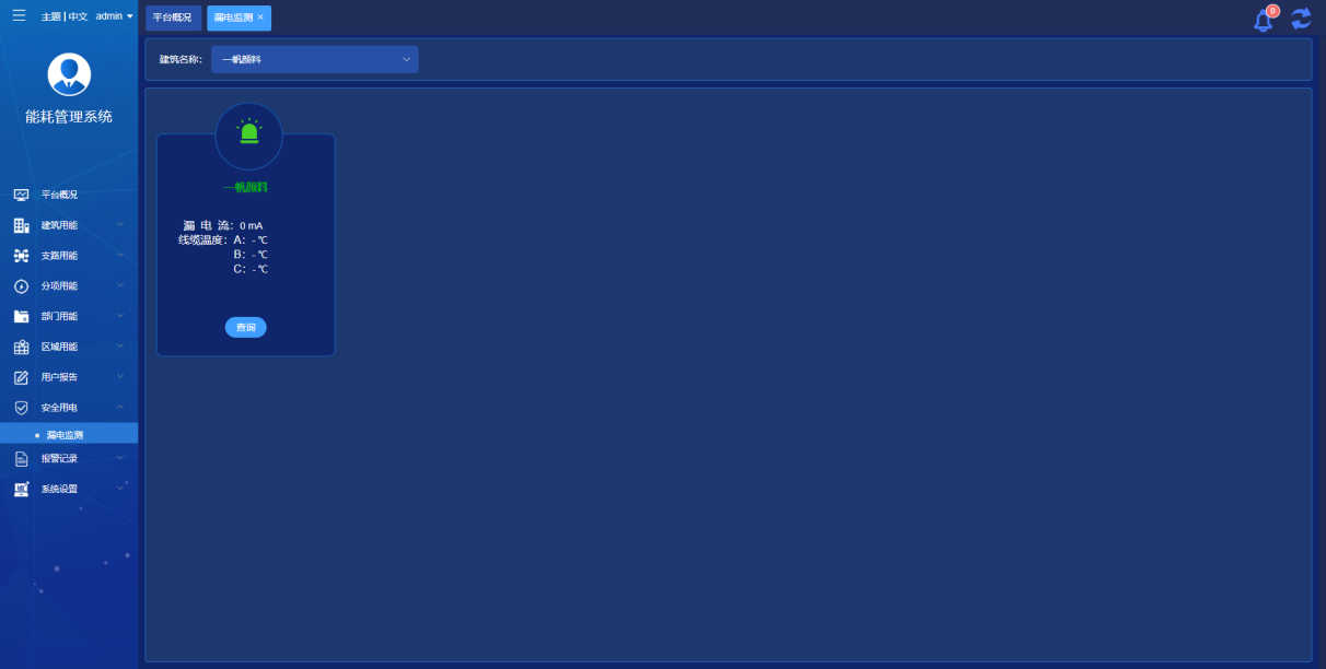 通過監(jiān)測配電回路的漏電電流和線纜溫度來分析商業(yè)中心的用能安全。在商業(yè)樓、辦公樓、酒店樓層配箱進線和出線回路安裝漏電探測器和溫度傳感器,其它建筑進線處安裝漏電探測器和溫度傳感器。